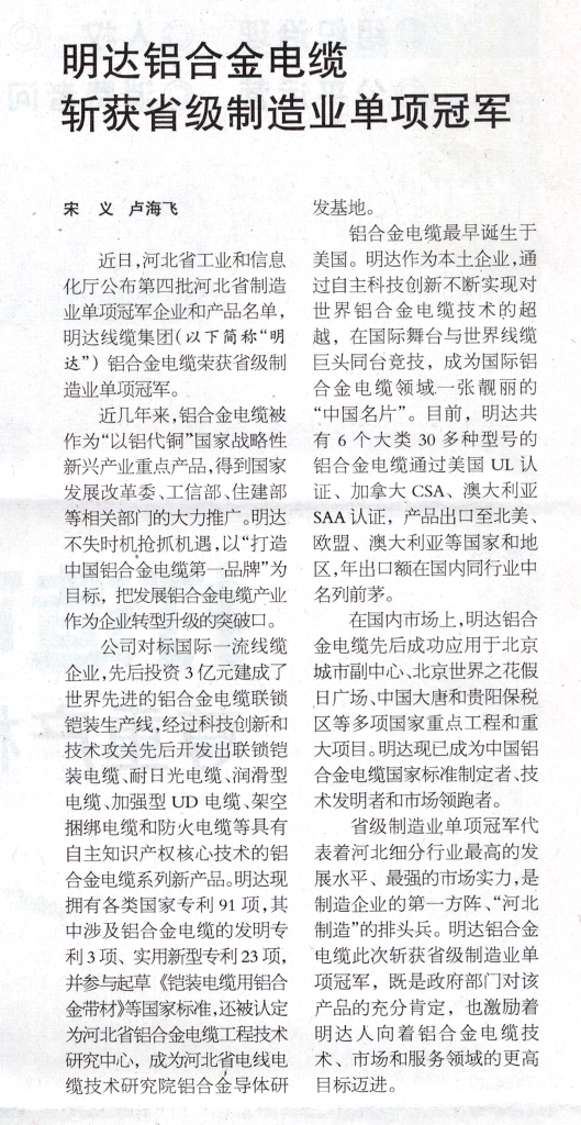近日,河北省工業(yè)和信息化廳公布第四批河北省制造業(yè)單項冠軍企業(yè)和產(chǎn)品名單,明達(dá)線纜集團(以下簡稱“明達(dá)”)鋁合金電纜榮獲省級制造業(yè)單項冠軍。